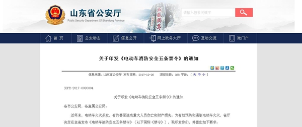 為預防和遏制電動車火災,保護人身財產安全,維護公共安全,根據《中華人民共和國消防法》、《山東省消防條例》等法律法規,山東省公安廳發布禁令如下: