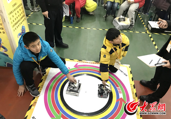賽前,參加機器人相撲對抗項目的小選手們認真做準備。