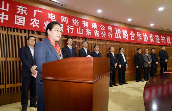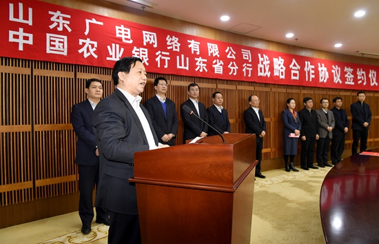 “長期以來,我們兩家保持著良好的合作。此次簽署戰略合作協議,正是順應發展需求,雙方強強聯合,實現優勢互補!鄙綎|廣電網絡有限公司黨委書記、董事長李建華在致辭中表示,山東廣電網絡有限公司是按照現代企業制度建立的省屬國有大型骨干文化企業,是全省宣傳思想文化領域的重要陣地。近年來,中國農業銀行山東省分行為山東廣電網絡有限公司的發展提供了優質高效的金融服務。農業銀行各分行、支行與廣電網絡各分(子)公司都有緊密的業務往來,積極參與了有線電視代繳費工作。