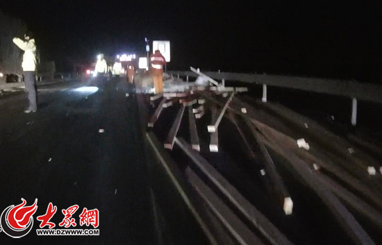 掉落的木材造成交通短時封閉,交警和路政緊急清理現場