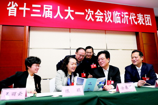 1月27日,出席省十三屆人大一次會議的臨沂團(tuán)徐春福代表(右二)向陳穎、張善久、徐光琴、徐仲圣(從左至右)等代表介紹光伏路面節(jié)能情況,就打好精準(zhǔn)脫貧攻堅戰(zhàn),助力沂蒙老區(qū)高質(zhì)量發(fā)展展開熱烈討論。記者 王世翔 報道