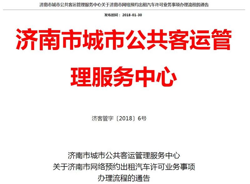 1月30日,濟南市交通委網站發(fā)布了《濟南市城市公共客運管理服務中心關于濟南市網絡預約出租汽車許可業(yè)務事項辦理流程的通告》。
