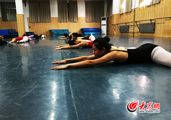 上午10點,大眾網記者來到山東省文化藝術學校,這里正在進行的是舞蹈表演專業的復試。藝考期間,這里承擔著山東藝術學院舞蹈學院相關專業的初試和復試。在緊挨著考場的一處練功房內,十幾名考生正在進行著一字馬、壓腿等考試前的準備工作。