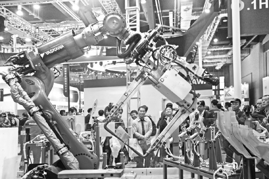 □CFP供圖  2017年11月7日,上海,第十九屆中國國際工業博覽會現場,觀眾在YASKAWA機器人的展位參觀。