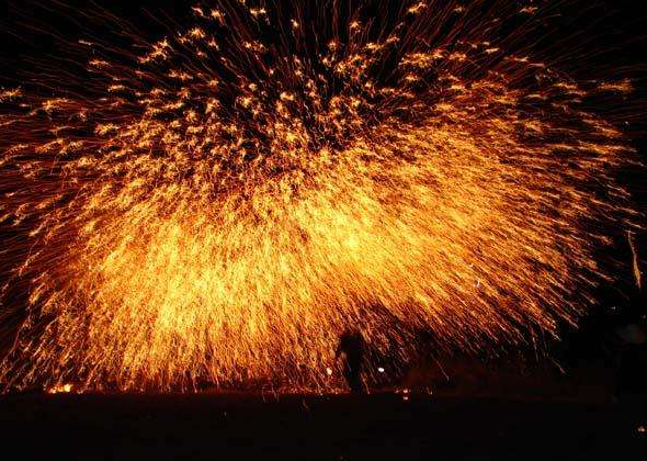 村民手拿盛有鐵水的桶,在夜幕中,呈圓形用力掄,鐵花濺起,形成一個個花環。現如今能夠熟練掌握這一技藝的人越來越少。近年來,為延續這一傳統民俗,讓村民在春節感受到傳統的年味,宋家村在掄鐵花上進行創新,通過自主研發逐漸用機器取代了人工,大大降低了人員操作的風險,而通過控制機器轉速的快慢,豐富了鐵花的形狀。