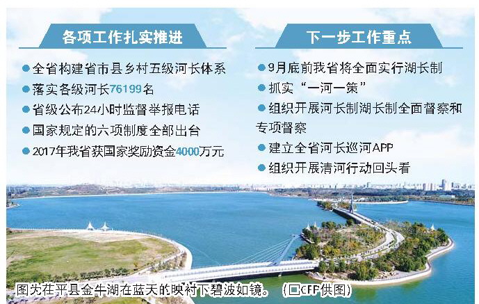 中央部署河長制湖長制工作以來,我省各項工作扎實有序開展。目前,全省構建了省市縣鄉村五級河長體系,落實各級河長76199名,設立了46047塊河長公示牌,省級公布了24小時監督舉報電話,河長會議、信息共享、信息報送、督察、考核、驗收等國家規定的六項制度全部出臺。通過建立完善河湖治理機制,全省開展了清河行動和入河排污口綜合整治,累計清理違章建筑和違法活動54531處,封堵非法設置的排污口2120個。2017年,我省作為全國河長制工作成效突出省份,獲國家獎勵資金4000萬元。