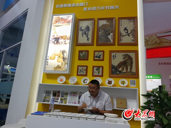 在齊魯優秀傳統文化傳承創新板塊,非遺糧畫吸引了眾多觀眾現場體驗。