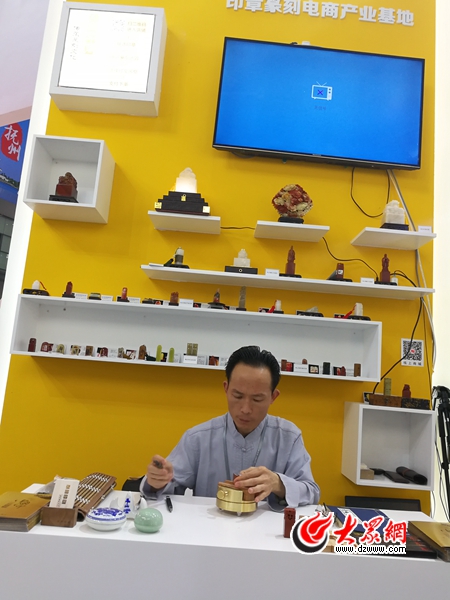 在曲阜印章展臺,孔府印閣的篆刻師張國亮現場展示傳統篆刻技藝。