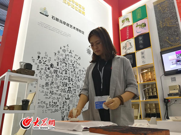 在石敢當摩崖藝術博物館展臺,工作人員現場演示“孔子見老子傳拓體驗板”。