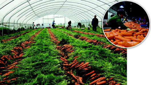 半島記者采訪獲悉,店埠胡蘿卜的銷售采用“包畝”形式,客商出價將整塊地產出的胡蘿卜全包下來!艾F在收獲的胡蘿卜是去年冬天播種的,經過130天成長期后成熟,客商會根據市場情況、胡蘿卜質量來出價。”耿文善說,今年一畝出產胡蘿卜8000斤左右,價格為8000元到1萬元,而去年的價格是4000元到5000元,整整翻了一番。