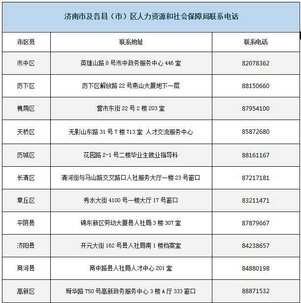濟南市及各縣(市)區人力資源和社會保障局聯系電話。