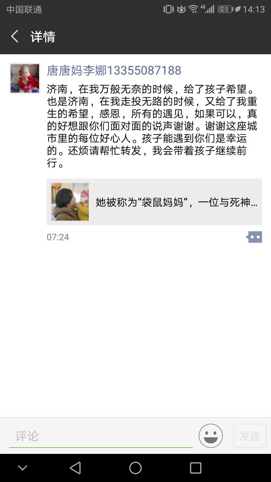 大眾網記者看到,李娜今早又在朋友圈發了一條信息,感恩好心人:“濟南,在我萬般無奈的時候,給了孩子希望。也是濟南,在我走投無路的時候,又給了我重生的希望,感恩,所有的遇見,如果可以,真的好想跟你們面對面的說聲謝謝。謝謝這座城市里的每位好心人。孩子能遇到你們是幸運的。我會帶著孩子繼續前行。”