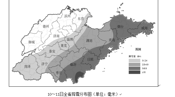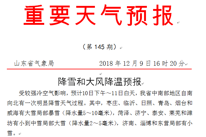 大眾網(wǎng)濟南12月9日訊 剛剛,大眾網(wǎng)記者從山東省氣象局獲悉,受較強冷空氣影響,預(yù)計10日下午~11日白天,我省中南部地區(qū)自南向北有一次明顯降雪天氣過程。其中,棗莊、臨沂、日照、青島、煙臺和威海有大雪局部暴雪(降水量5~10毫米),菏澤、濟寧、泰安、萊蕪和濰坊有小到中雪局部大雪(降水量2~5毫米),濟南、淄博和東營局部有小雪。