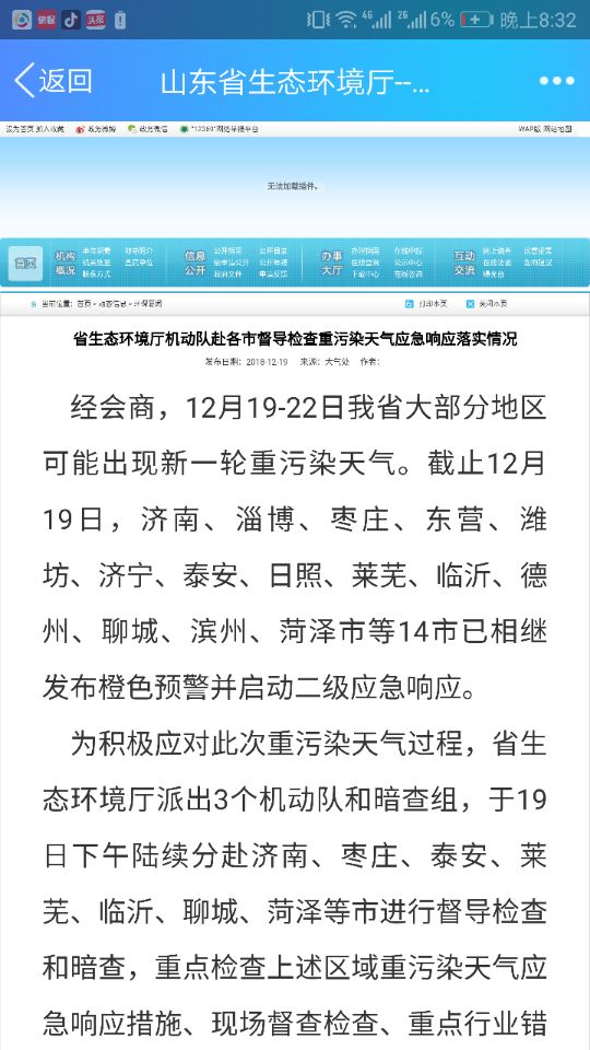 為積極應對此次重污染天氣過程,省生態環境廳派出3個機動隊和暗查組,于19日下午陸續分赴各地進行督導檢查和暗查,重點檢查上述區域重污染天氣應急響應措施、現場督查檢查、重點行業錯峰運輸聯動等落實情況,對發現的突出問題及時予以通報、曝光。