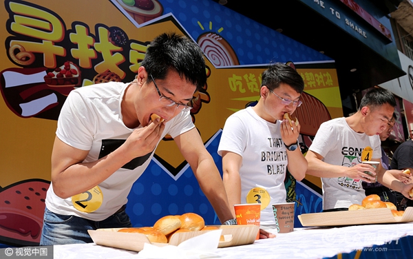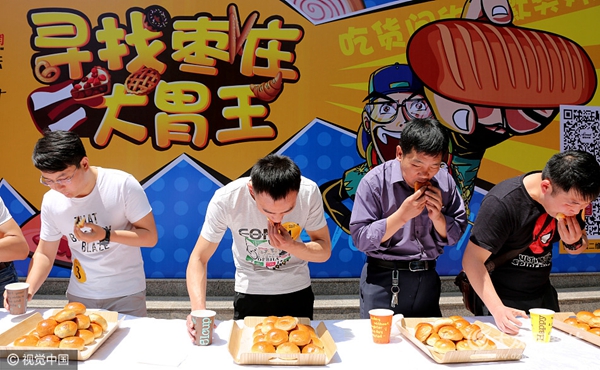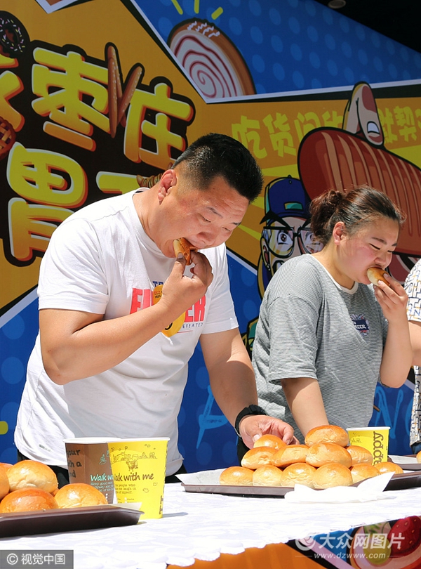 大眾網棗莊5月2日訊 4月30日,棗莊市一家面包房舉辦吃蛋糕、面包比賽競選“大胃王”活動。此次比賽分為情侶組、親子組、單人挑戰組3個組別,參賽者在規定的時間內吃的最快、最多者獲勝,吸引眾多市民報名參賽,為“五一”佳節增添樂趣。(圖片作者:吉喆/視覺中國)