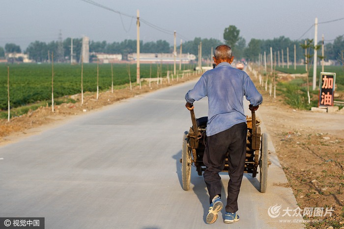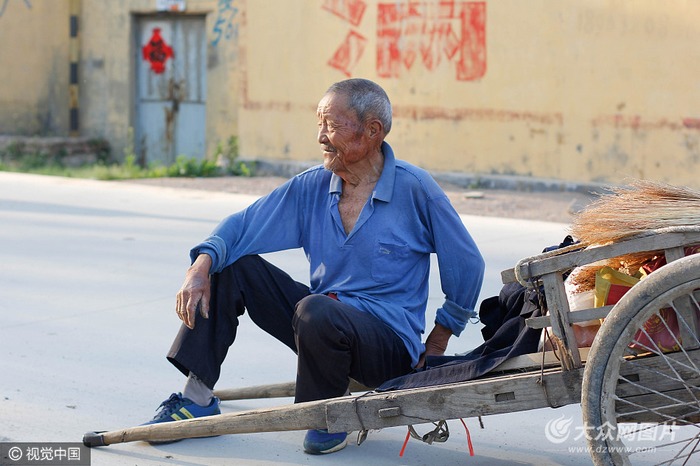 這是87歲耄耋老人平淡而又樸實的一天。時間的車輪在前行,老人的平板車的也在前行,只是老人的車輪紋路漸漸被磨平。(廖鍵/視覺中國)