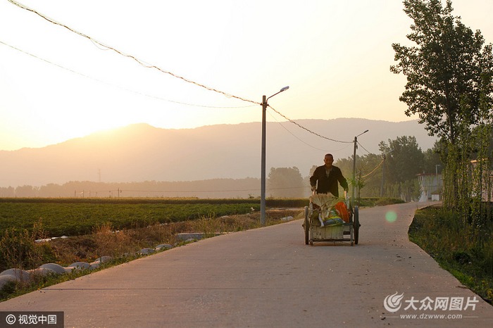 在青山的映襯,朝陽下的老人,推著他的平板車。