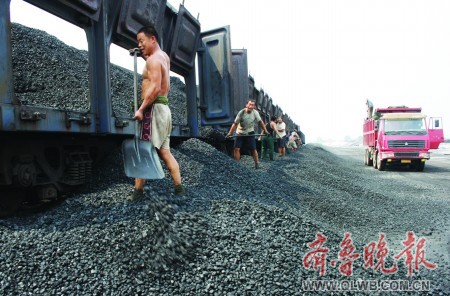 27日,在濰坊市煤炭交易市場,十幾節(jié)裝滿晉煤的車皮正停靠在月臺上,工人們正在緊張卸煤。 王媛 攝