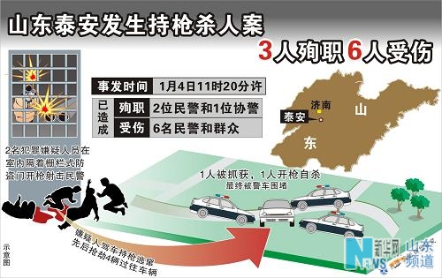 新華網山東頻道1月4日電(記者王志)記者從山東省泰安市有關部門獲悉,1月4日11時20分許,泰安市發生一起持槍殺人案件,截至記者發稿時,9位受傷的民警和群眾中,有2位民警和1位協警不幸殉職;兩名犯罪嫌疑人1人被抓獲,另一人開槍自殺。