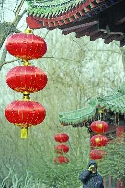 1月5日,濟南護城河畔,一排排大紅的燈籠高高掛起,讓游玩的人們不禁感受到年越來越近了。 本報記者 王媛 攝