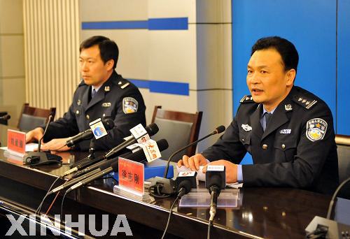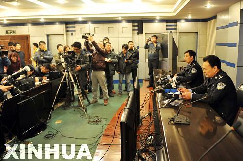 1月5日,泰安市公安局副局長徐志剛(右)在新聞發(fā)布會上通報犯罪嫌疑人情況。新華社記者 朱崢 攝
