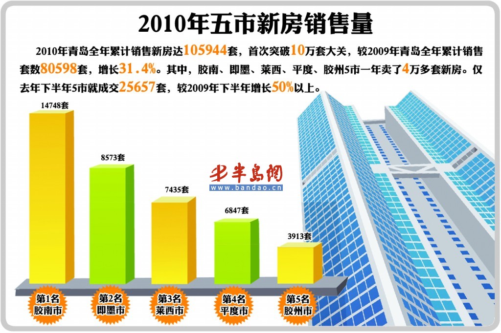 根據(jù)青島市房地產(chǎn)交易中心公布的數(shù)據(jù),2010年青島全年累計銷售新房達105944套,首次突破10萬套大關,較2009年青島全年累計銷售套數(shù) 80598套,增長 31.4%。值得注意的是,五市一年賣了4萬多套新房,在青島樓市中的地位開始提升。從各區(qū)市成交情況看,膠南市以14748套排在2010年全市各區(qū)成交量的第一名,膠南市在2010年度有兩次月度成交超過兩千套,1月份成交2044套,5月份成交2431套。