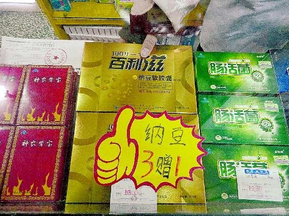 6日,煙臺(tái)北馬路上的某藥房,百利滋納豆軟膠囊售價(jià)為每盒180元,并有買三贈(zèng)一的活動(dòng)。營(yíng)業(yè)員向記者介紹:百利滋納豆軟膠囊每盒的含量為60粒,食用方法為每日兩次,每次2粒,溫開水送服。