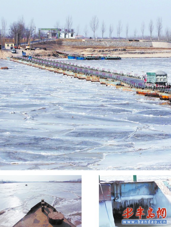1月20日,冰凌已堵塞黃河入海口河道,隱患重重。 東營一座浮橋邊上堆積著厚厚的冰凌 。(小圖)