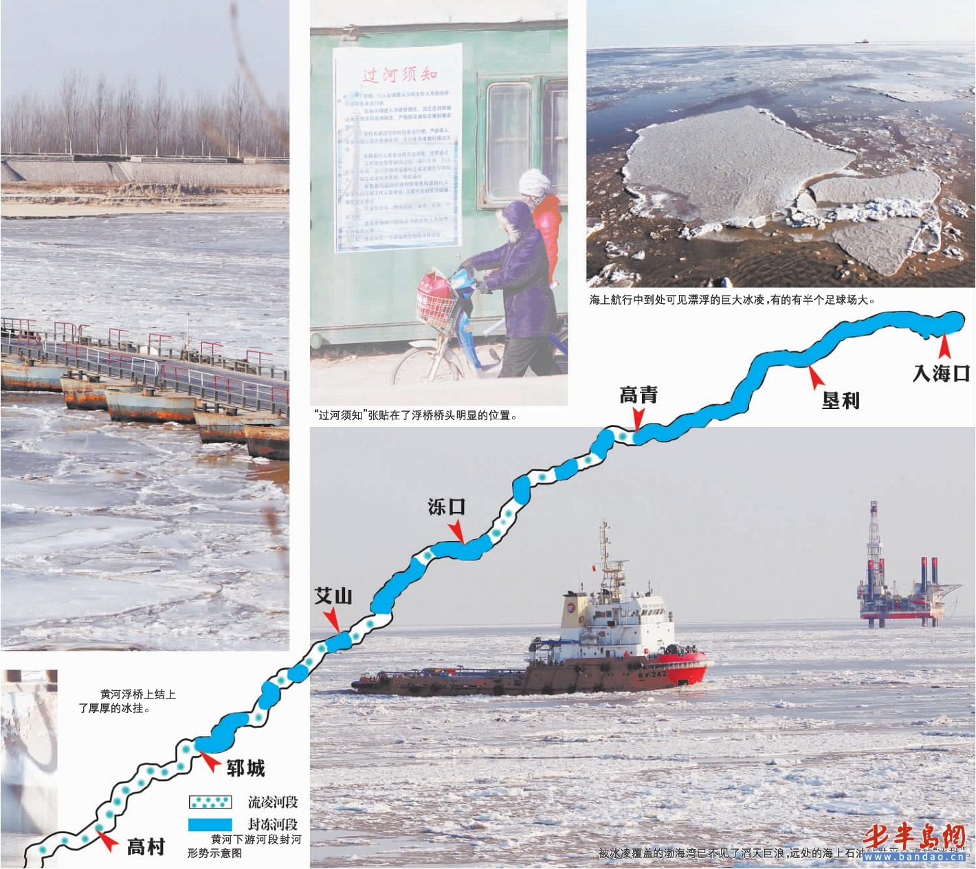 黃河河口管理局的工作人員說,目前,黃河河口段封河速度開始加速,入海口也開始出現凌汛。據預報,現在的渤海灣冰封已經比較嚴重,一般情況下最嚴重的冰期是出現在1月中旬至2月上旬,浮冰最大外緣線能達到25海里,平整冰厚度一般為10至20厘米,最大達40厘米。