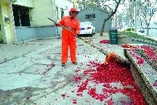 滿地的鞭炮紙屑給環(huán)衛(wèi)工人清掃帶來(lái)很大麻煩。 趙偉 攝