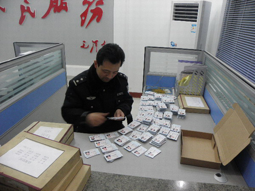 春節(jié)前后,民警們利用休息時(shí)間加班加點(diǎn),將2000多張未領(lǐng)取的二代身份證按照各個(gè)行政村分別進(jìn)行整理。利用春節(jié)期間下村走訪和下村辦案的時(shí)機(jī),將身份證送到群眾手中。通過開展此次活動(dòng),民警共送證300余張,受到了轄區(qū)群眾的廣泛好評(píng)。圖為民警劉永剛在整理為外出務(wù)工人員所辦理的二代身份證。