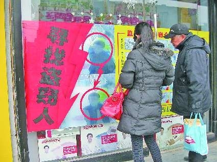 ▲藥店制作的尋找盜竊人的大海報(bào)在店門口張貼,吸引了市民觀看。