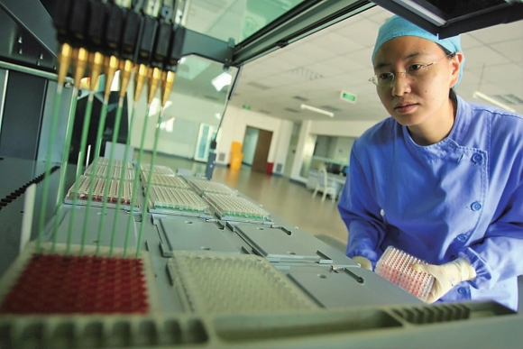 工作人員將需要檢驗的血樣試管排成一排,做好檢測前準備,然后將血液試管裝入全自動血液檢測系統,系統會自動進行血液篩查項目的檢測。按照國家規定,一份血液在檢驗科必須做四項檢測,包括乙肝表面抗原、丙肝抗體、艾滋病抗體、梅毒螺旋體抗體,而且需要用傳統的檢驗方式各做兩遍。對合格血液,將再進行一遍血液核酸檢測。核酸檢驗合格后,會通過微機系統通知供血科。