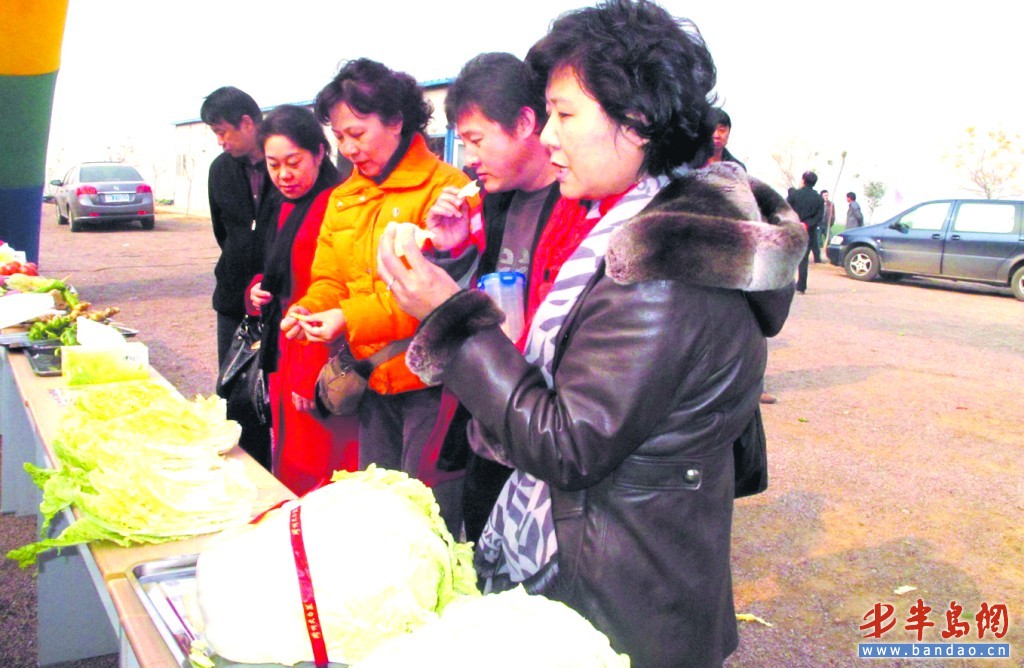 在現場,記者還見到有不少從外地前來訂購的客商 ,他們不時品嘗生的大白菜葉,并且贊不絕口。“知道膠萊鎮今天舉行大白菜訂貨會,就匆匆從北京趕了過來,我們今年又訂購了5000箱大白菜,這些白菜很快就會銷售一空的!北本┣f勝崇光大廈的周蘭經理告訴記者。
