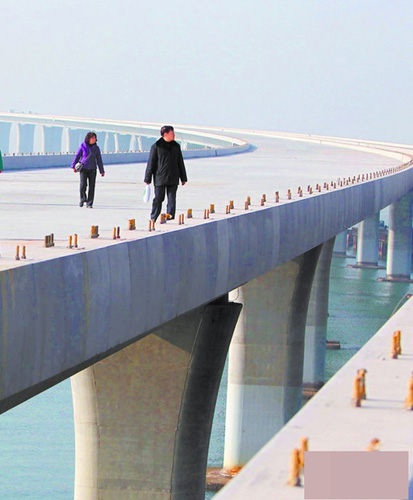據(jù)介紹,海灣大橋于2006年12月26日在黃島側(cè)第十合同段打下第一棵鉆孔灌注樁,歷時近四年的時間,實(shí)現(xiàn)了青島到黃島的成功連接。大橋在建設(shè)過程中,經(jīng)受住了海上施工風(fēng)浪大、大霧、海冰多等不利氣候條件的考驗,克服了物價上漲等不利因素,在質(zhì)量、安全、環(huán)保等方面都保持了良好局面。
