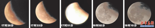 青島觀象臺臺長孫立南介紹說,剛看到月亮時,已經到達生光階段。這時月亮呈現出紅色,是因為地球擋住了太陽的光輝,只有部分太陽光經過地球大氣層折射后打到了月亮上 ,就像傍晚時分,天空中的云層會變成紅色一樣。后來,地球的遮擋越來越少,月亮就呈現出本來的黃色。“這次看到的‘帶食而出’雖然很美麗,但觀測條件并不是很有利,不能看到月全食的全部過程。”孫立南說,天文愛好者明年還有觀賞月食的機會,分別在6月16日和12月10日 。6月16日的是月偏食,12月10日那次,我國可以看到月全食的全過程。