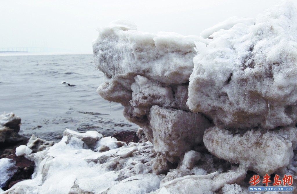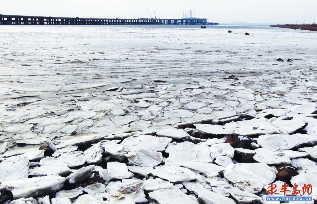 冷空氣卷土重來,不僅拉低了本市的溫度,也推動了膠州灣的冰情發(fā)展速度。5日,記者來到跨海大橋附近看到,海冰龜裂般鋪在海岸上,并伸向海里。白色的“冰磚”漂浮在海面上,“冰帶”綿延數(shù)百米。