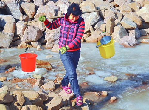 1月23日,北宅街道暉流社區居民李秋蘭在挑水。