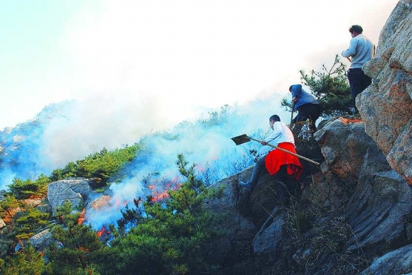 4日上午11時,位于日照市東港區的河山山系發生大火,逾千軍民緊急上山滅火。本報見習記者 張照朋 攝
