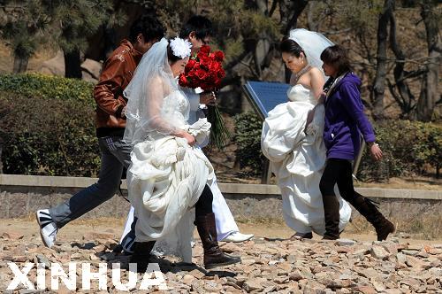 新華網山東頻道4月6日電 隨著氣溫回暖,山東青島海濱婚紗照拍攝生意又開始忙碌起來,前海一線各景區內隨處都能見到正在拍攝或匆匆趕往下一拍攝點的新人。據了解,以親近大海為主題的婚紗照每年都會吸引來眾多的顧客,已在當地形成集藝術照拍攝、蜜月旅游、集體婚禮等一條龍服務完整的產業鏈。