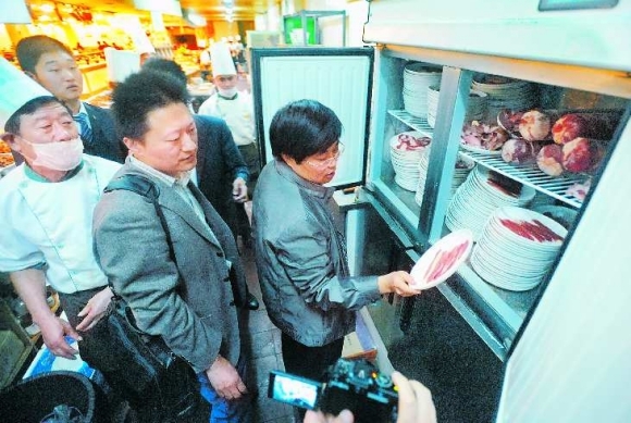 本報關于烤肉店用鴨肉冒充牛羊肉的報道引發社會強烈關注。29日下午,濟南市食品藥品監督管理局采取行動,對位于省城二環東路與華龍路交界處的阿郎山烤肉店進行了突擊檢查。面對執法人員,該店經理對店中擺放的肉品是羊肉還是鴨肉與員工的說法互相矛盾。執法人員還在廚房發現了一包僅剩少量的牛肉粉。 本報記者 攝