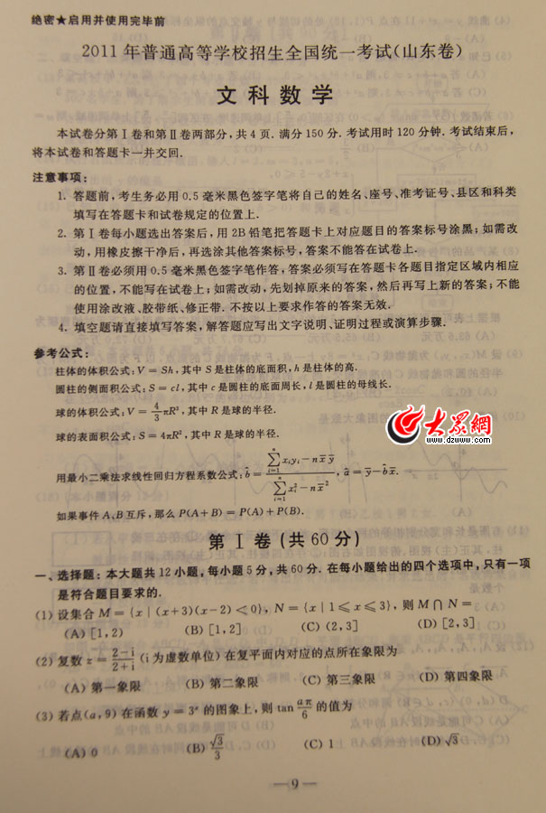 2011年山東高考文科數(shù)學試題及參考答案