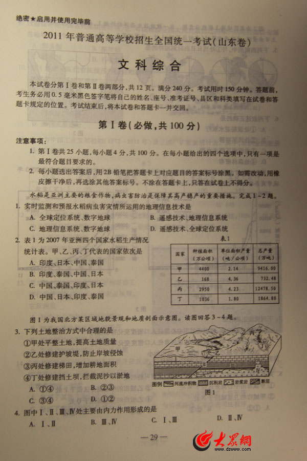 2011年山東高考文科綜合試題及參考答案