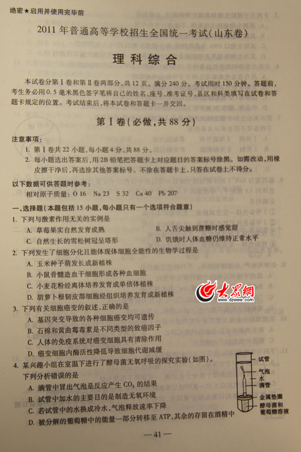 2011年山東高考理科綜合試題及參考答案