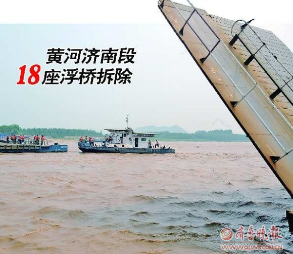 6月24日,濼口浮橋工作人員正在拆除浮橋。受第11次調水調沙下泄流量影響,黃河山東段水位逐漸升高,為確保調水調沙洪水順利下泄,濟南黃河沿線18座浮橋已全部拆除。 本報記者 張中 攝