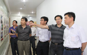 山東老年書畫研究會名譽會長宇培杲(左二),山東新聞書畫院院長、山東新聞美術家協會名譽主席劉廣東(左三),大眾網董事長、總經理林忠禮(左一),濟南保利置業有限公司總經理耿立致辭共同為保利圖書館揭幕。