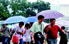 8月18日,濟(jì)南市民雨中行。據(jù)山東省氣象臺預(yù)報(bào),從18日開始到21日,山東持續(xù)陰雨天氣。綿綿秋雨一掃之前的酷熱,全省最高氣溫降到27攝氏度左右,下降幅度超過5攝氏度,令人倍感涼爽。