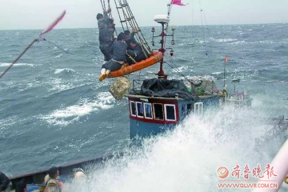 A03?重點 17日,救援人員用救生吊籃將被大浪困住的漁民吊起。當日10時左右,一艘遼寧籍漁船在煙臺東北49海里處捕魚作業時遭遇9級大風,船艙進水,即將沉沒,11名船員命懸一線。交通運輸部北海救助局收到救助指令后,經過近半小時的生死營救,將遇險船員全部救起。 本報記者 張琪 通訊員 張寧 原明偉 攝影報道