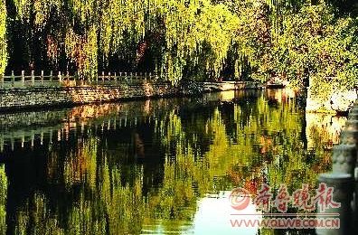 21日,護城河水分外安靜清澈,垂柳倒映在水中形成美麗的圖畫,顯示出秋季獨有的魅力。本報記者 周青先 攝