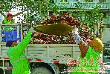 24日,園林部門的工人出動車輛清理落葉。 本報記者 周青先 攝